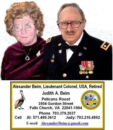 Background - Alexander Iosiphovich Beim (Al Beim) is descendent from a long line of Russian Karaims in the Crimea, tracing his lineage to the 16th century. After evading the Communists and persecution by the Nazis, his family immigrated to the US at the end of World War II. He graduated from Nyack High School in 1955. College Highlights - He has a bachelor's degree in mathematics from The Ohio State University, a master's degree in public and personnel administration from the George Washington University and is a graduate of the Army Command and General Staff College. Marriage and Family Highlights - He met his wife Judy Chamberlin while both were attending The Ohio State University. They were married on the same day that he graduated and received his commission as a Second Lieutenant. They now live in Falls Church, Virginia. They have two sons: Peter J. Beim is a Colonel in the Army, currently in the Washington DC area, and Alexander Beim II who is a planner for the Central Ohio Transit Authority in Columbus. Military and Career Highlights – Al Beim retired after 50 years of Federal Service: 30 in the military and 20 in the US Civil Service. After 5 years of active and reserve service as an enlisted man, he was commissioned as a Lieutenant in Air Defense Artillery. Later, he spent most of his career heading various personnel offices and activities and directing administrative systems and programs. He served a one-year combat tour in Vietnam and three very enjoyable tours in Europe: in France, Germany and the Netherlands. His assignments included duty with the Defense Communications Agency, the North Atlantic Treaty Organization, the Office of the Army Adjutant General, and the Office of the Secretary of the Army. Following his retirement from the military he was a manger in human resources of the National Guard Bureau and then worked many years as an Associate Director in the National Zoo of the Smithsonian Institution. Achievements/Awards/Outstanding Events – Al Beim has been an author and editor for many years. His many articles on micrographics and records management have appeared in various professional magazines. He also served as contributing editor to Government Data Systems and editor of the Federal Micrographics Bulletin. Among his awards are the Legion of Merit, the Defense and the Army Meritorious Service Medals, the Bronze Star, the Joint Commendation Medal, the Distinguished Service Citation from the National Micrographics Association, and the Eagle Award and Heritage Award from the National Guard Bureau. He has also received numerous civilian Merit and Special Service awards. Al’s latest publication is a cookbook he wrote jointly with his wife—both enjoy good food and are accomplished chefs. Their book of favorite recipes, We Live in Order to Eat, is available on http://www.amazon.com; enter Judy and Al Beim in the search box. |